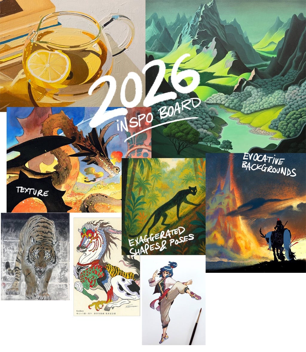 I’ve pulled together a moodboard of other artists’ work that will serve as my visual inspiration for 2026. This is a great exercise to do every so often as it helps identify what you’re attracted to as an artist, and may show up things you currently lack or wish for in your own work! Tastes also change throughout one’s life and career so it’s always great to take the time to sit, admire the artwork you love and understand why.